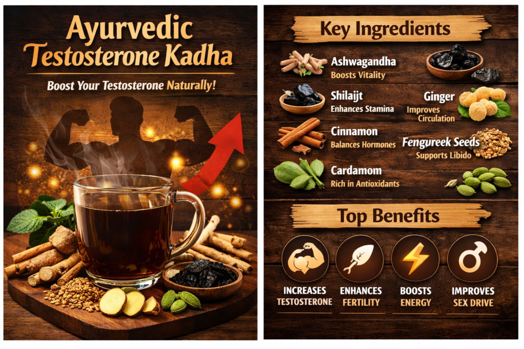 A testosterone kadha is a potent Ayurvedic herbal tea or decoction specifically formulated using vajikarana (virilization) herbs — a sub-branch of Ayurveda dedicated entirely to male sexual health, strength, and longevity. These herbs work synergistically to support the body’s natural testosterone production pathways rather than flooding it with exogenous hormones.