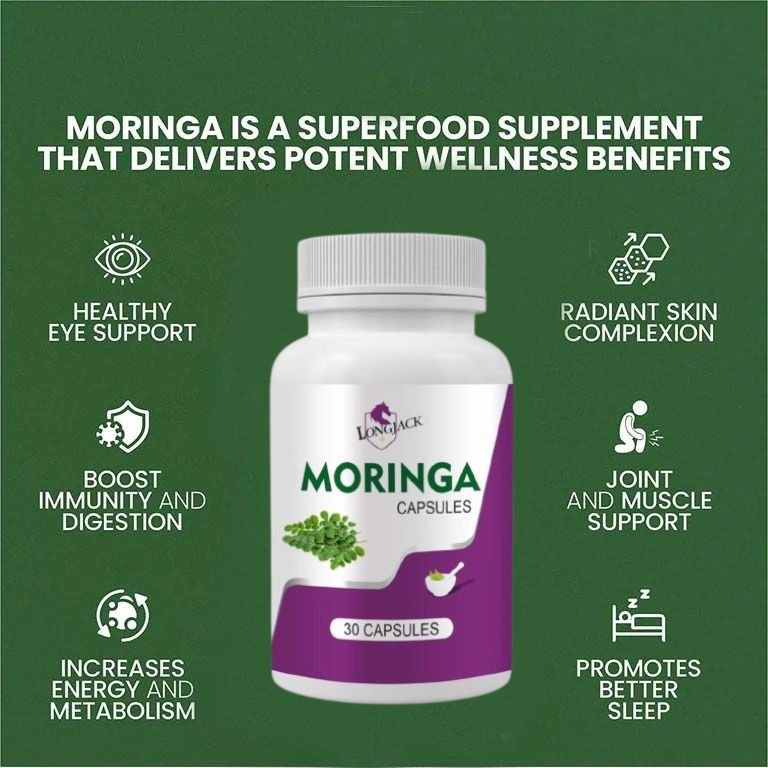 moringa oleifera is a great source of potassium and vitamin C. it is rich in Calcium, Iron, Potassium, Vitamins A and C, and Protein. This organic marvel helps to improve your vision and strengthen your bones. Nature’s Multiple Vitamin Moringa Oleifera, also referred to as the KING OF ALL SUPERFOODS, is widely acknowledged worldwide as the most nutritious plant ever found. The purest and most powerful source of antioxidants and minerals that can restore life on Earth is moringa. It is a great source of vitamins, minerals, amino acids, and antioxidants that are present in longjack Moringa oleifera capsule that can SUPERCHARGE YOUR LIFE.
